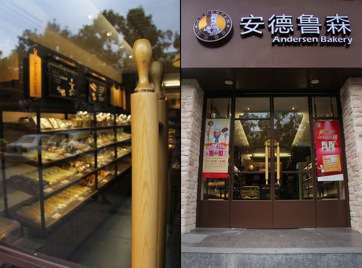 Пекарня Andersen Bakery в китайском городе Сямынь использует скалки и разделочные доски как один из элементов декора. Вид скалок, в частности, имеют дверные ручки и держатели вывесок, а разделочные доски с логотипами развешены на стенах. Кроме того, стоит отметить и довольно умелое использование внутреннего пространства с размещением полок с продукцией вдоль двух противоположных стен, что создает очень уютную атмосферу заведения.